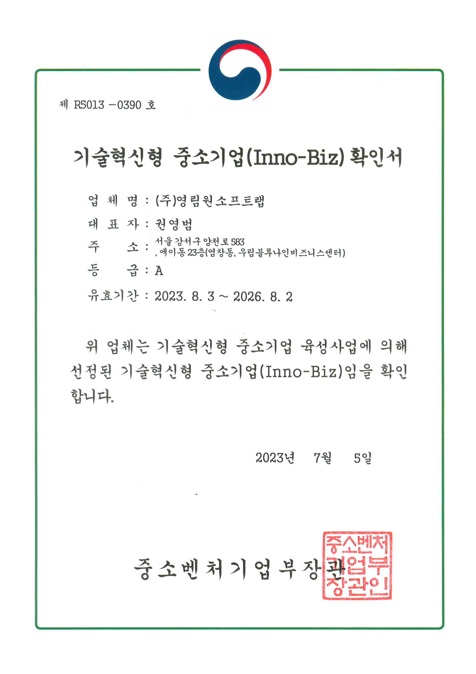 기술혁신형 중소기업(Inno-Biz) 확인서