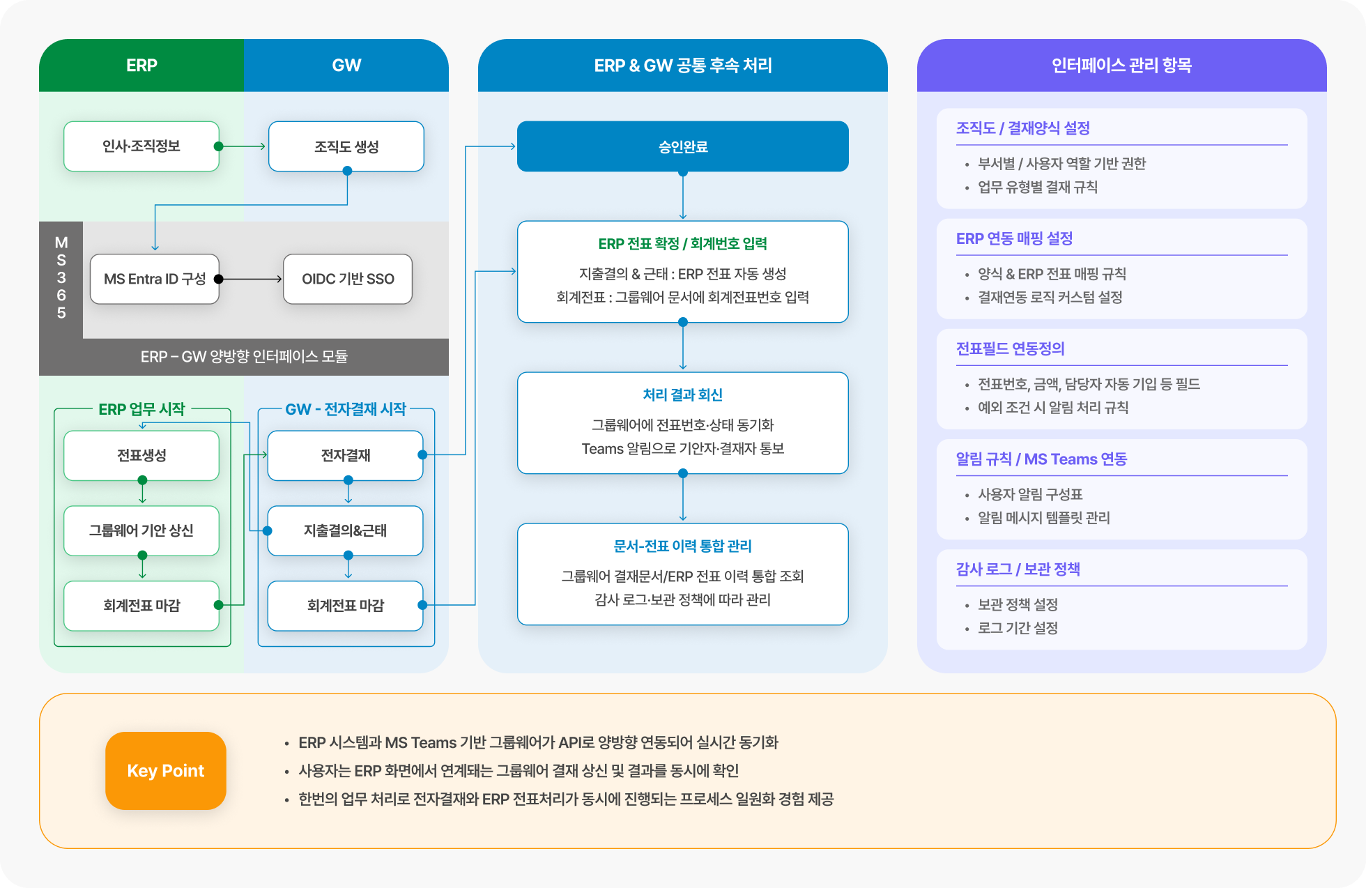 - ERP–그룹웨어 간 데이터 연동으로 이중 입력 작업이 사라지고, 결재 완료 시 ERP 전표가 자동 생성되는 등 업무 프로세스가 자동화