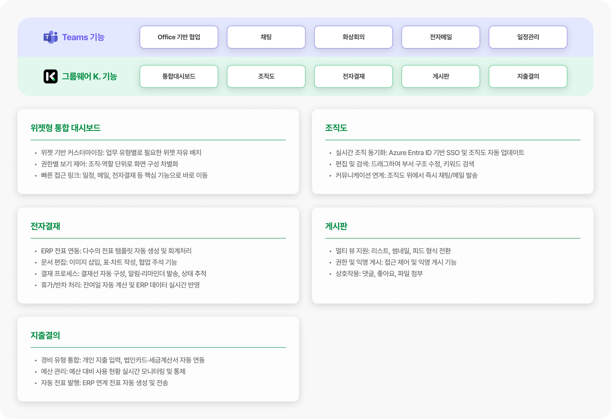 그룹웨어 케이닷은 대시보드, 조직도, MS Teams 기반 통합, 전자결재, 커뮤니티 게시판, 지출결의 기능으로 구성되어 있습니다.